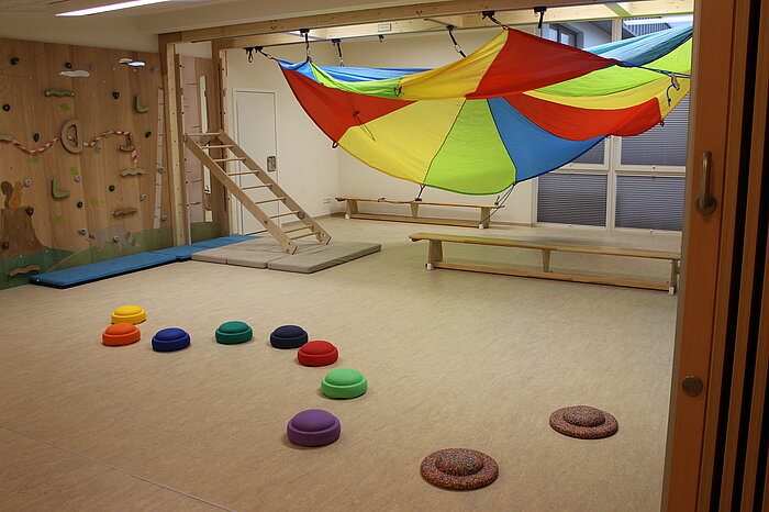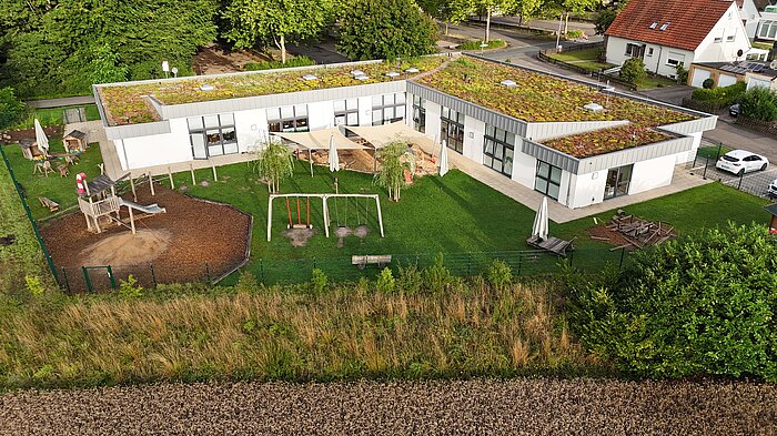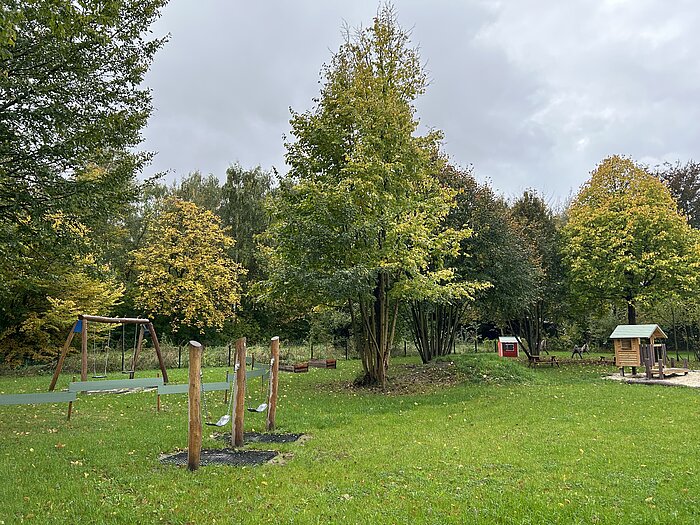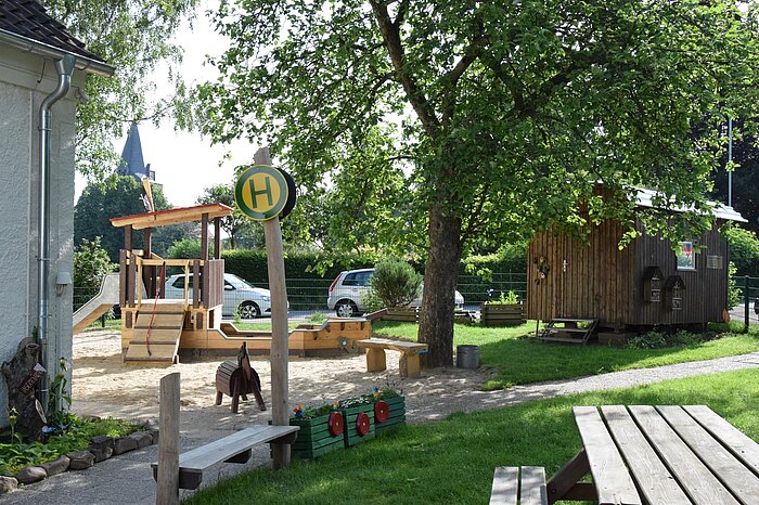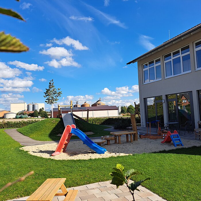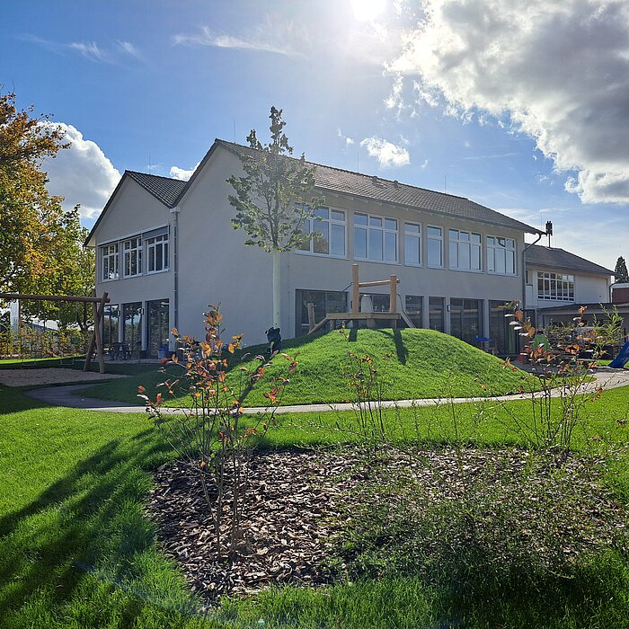 Auf dem großzügig gestalteten Außengelände können die Kinder ihrem Bewegungsdrang nachgehen. Eine Hügellandschaft, eine Sandfläche und ein Ballplatz bieten hier reichlich Möglichkeiten.